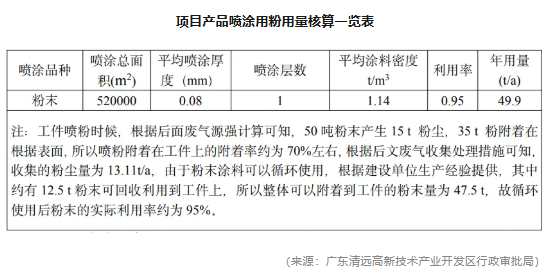 根據(jù)項(xiàng)目情況,項(xiàng)目根據(jù)客戶需求對產(chǎn)品進(jìn)行噴涂,根據(jù)建設(shè)單位提供的數(shù)據(jù)需要噴粉的工件約為400萬件,投資1000萬元,項(xiàng)目總噴涂面積約為520000m2.依據(jù)噴涂行業(yè)對油漆使用量的計(jì)算方法,計(jì)算得出項(xiàng)噴粉目用量約49.9噸/年,故本項(xiàng)目粉末原料50噸是合理的。