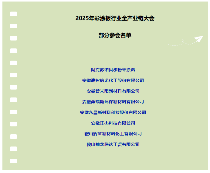 大會還邀請到國家環保部門領導、行業商會領導等,中國建筑金屬協會鋼結構分會、博興縣金屬板業協會商會、博興縣政府經濟開發區管委會等負責人及相關領導將悉數出席。與此同時,山東冠洲股份、天津新宇彩板、寶鋼股份、河鋼、寶武鋼鐵、藍天板業、河北兆建、京南新華等幾十家鋼板龍頭企業采購、技術負責人將親臨會議現場,與涂料、原材料企業共同探討未來彩涂板行業的綠色高質量發展之路。