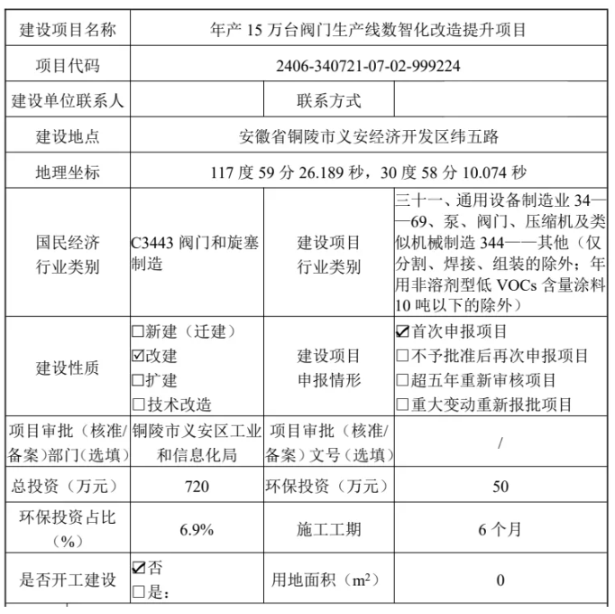 銅陵市肆得科技股份有限公司成立于 2010 年 2 月,注冊資本 200 萬元。2021 年 7 月,銅陵市肆得科技股份有限公司建設年產 15 萬臺套智能化高性能流體控制閥建設項目,該項目于 2021 年 7 月 29 日獲得《義安區發展改革委項目備案表》(項目代碼:2107-340721-04-01-234098);2021 年 12 月 23 日,銅陵市義安區生態環境分局以“義環評(2021)48 號”文件對該項目進行了審批;2023 年 8月,該項目完成竣工環境保護驗收。