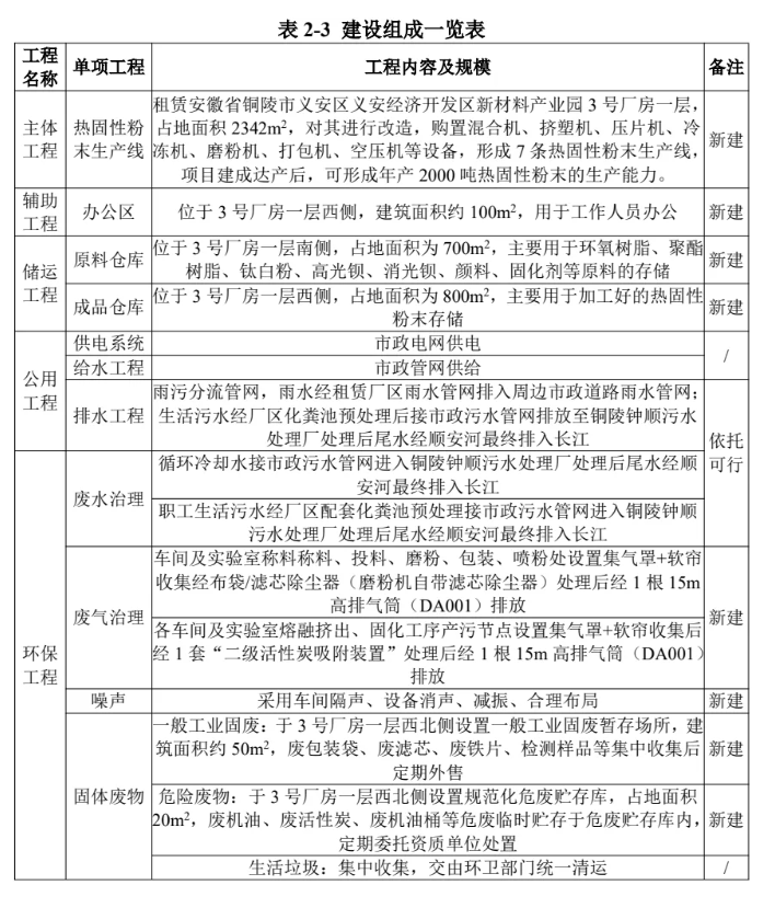 銅陵昶祥新材料科技有限公司擬于安徽省銅陵市義安區義安經濟開發區新材料產業園建設年產2000噸新能源汽車、白色家電新材料項目(一期),系租賃銅陵金橋建設投資有限公司新材料產業園 3#廠房一層,占地面積 2342m2.對其進行改造,購置混合機、擠塑機、壓片機、冷凍機、磨粉機、打包機、空壓機等設備,項目建成達產后,可形成年產2000噸熱固性粉末的生產能力。
