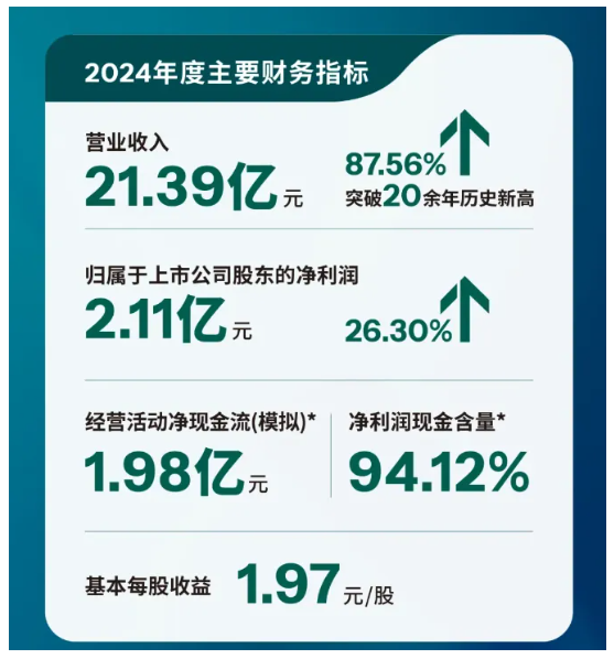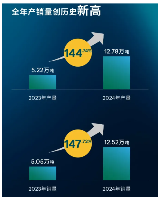 在關(guān)鍵財(cái)務(wù)指標(biāo)上,麥加芯彩成績斐然。全年?duì)I業(yè)收入達(dá)到21.39億元,同比大幅增長87.56%,成功刷新了成立20多年來的歷史最高紀(jì)錄;歸屬于上市公司股東的凈利潤為2.11億元,同比增長26.30%,盈利能力穩(wěn)步增強(qiáng);產(chǎn)量和銷量分別提升至12.78萬噸與12.52萬噸,較2023年分別增長144.74%和147.72%,產(chǎn)量、銷量、營收三大核心指標(biāo)均創(chuàng)歷史新高。這些亮眼的數(shù)據(jù)不僅彰顯了麥加芯彩過去一年的輝煌成就,也預(yù)示著其在未來市場競爭中充滿無限潛力,有望持續(xù)引領(lǐng)行業(yè)發(fā)展潮流,為行業(yè)的發(fā)展樹立新的標(biāo)桿。