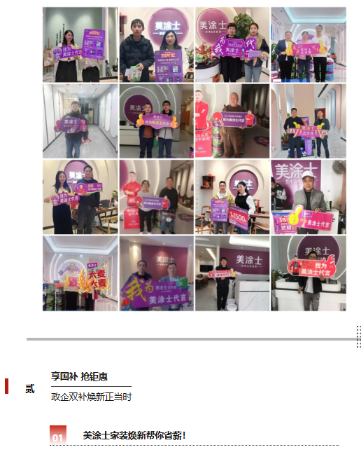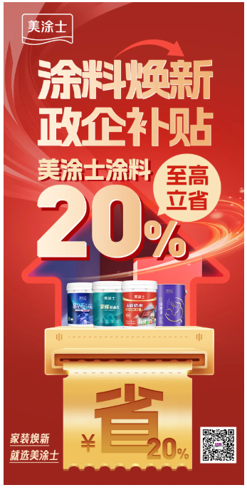 隨著2025年新一輪勁爆國補火熱來襲,美涂士快速響應號召,積極參與各地家裝“煥新”補貼活動,因地制宜在全國范圍內推出多項鉅惠購漆政策,政企雙重補貼,煥新美家至高立省20%,無論是新房裝修亦或者舊房翻新,消費者均能享受到美涂士藝術漆、仿石漆、乳膠漆、防水基輔材四大品類產品帶來的多重福利。