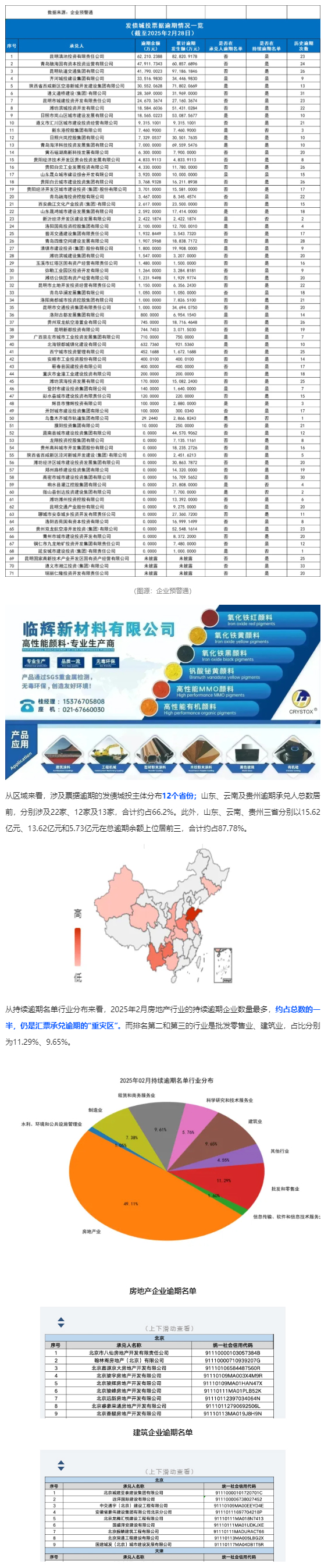 在公布的5314家持續逾期名單中,涉及71家發債城投,票據總逾期余額39.84億元,納入承兌人逾期名單20家,納入持續逾期名單65家。