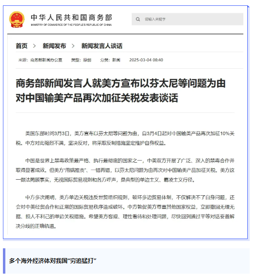 2025年3月3日,白宮鑒于芬太尼供應鏈管控問題,將對中國加收關稅從10%提升至20%,自3月4日起生效,針對全品類。