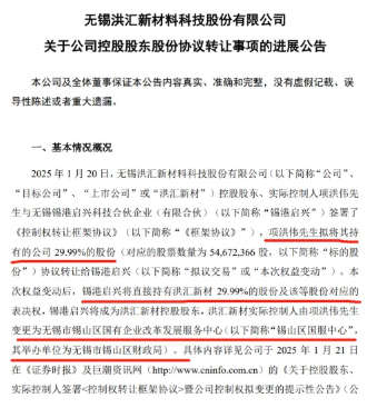 近日,據無錫洪匯新材料科技股份有限公司發布《關于公司控股股東股份協議轉讓事項的進展公告》稱:洪匯新材控股股東、實際控制人項洪偉與無錫錫港啟興科技合伙企業(有限合伙))簽署了《股份轉讓協議》,項洪偉擬將其持有的公司29.99%的股份(對應的股票數量為54.672.366股)協議轉讓給錫港啟興。
