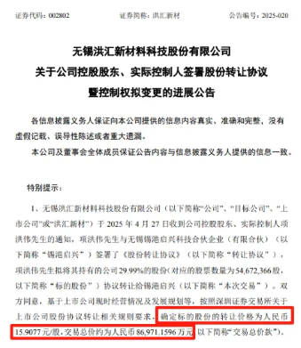根據洪匯新材2025-020號公告顯示,標的股份的轉讓價格為人民幣15.9077元/股,交易總價約為人民幣86.971.1596萬元。本次交易不觸及要約收購,不構成關聯交易。