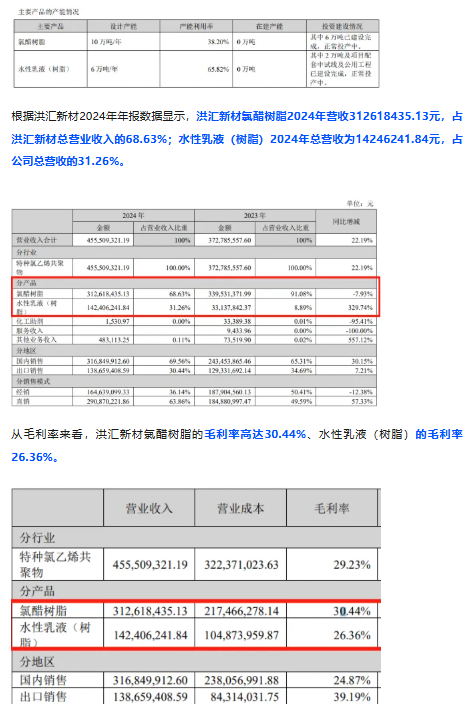 根據洪匯新材2024年年報數據顯示,洪匯新材氯醋樹脂的設計產能為10萬噸/年,產能利用率為38.20%,水性乳液(樹脂)設計產能為6萬噸/年,產能利用率為65.82%。其氯醋樹脂產品長期與國外企業(如德國瓦克集團、日本信越化學工業株式會社等)進行競爭之外,還不斷研發拓寬產品系列及應用領域。