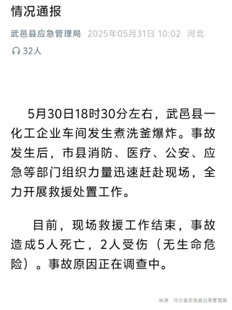 5月31日,河北省武邑縣應(yīng)急管理局發(fā)布通報(bào):5月30日18時(shí)30分左右,武邑縣一化工企業(yè)車(chē)間發(fā)生煮洗釜爆炸。事故發(fā)生后,市縣消防、醫(yī)療、公安、應(yīng)急等部門(mén)組織力量趕赴現(xiàn)場(chǎng),全力開(kāi)展救援處置工作。