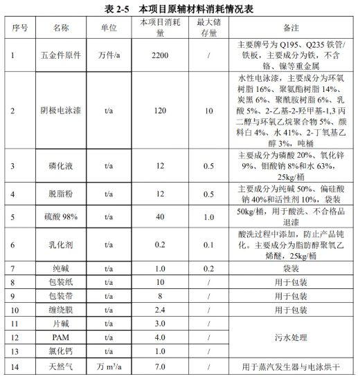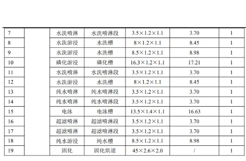 根據企業提供的資料,本項目電泳采用水性電泳漆,電泳漆固化后成膜厚度約0.1mm,干漆膜密度以1.25g/cm3計。電泳漆利用率以100%計,則本項目所需電泳漆固體份用量為55t/a。根據業主提供的電泳漆MSDS 資料,電泳漆固含量約55%,則理論上需要電泳漆100t/a,本項目電泳漆總用量為120t/a,可以匹配實際需求。