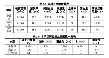 根據(jù)企業(yè)提供的噴漆行業(yè)的經(jīng)驗(yàn)數(shù)據(jù),平板噴涂線與流水噴涂線產(chǎn)能比 例為 3:7.調(diào)配好的漆料固份60%附著在工件表面,14%掉落形成漆渣、25% 形成漆霧、1%殘留在漆桶內(nèi)。
