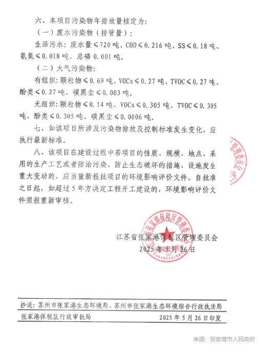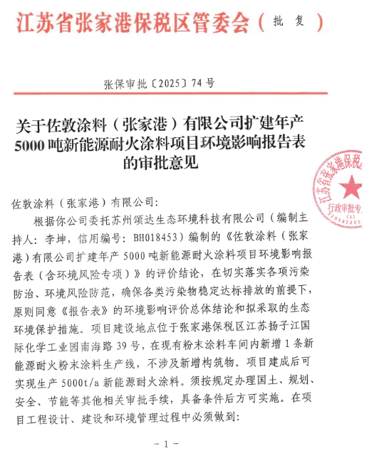 江蘇省張家港保稅區管委會批復稱:根據你公司委托蘇州頌達生態環境科技有限公司(編制主持人:李坤,信用編號:BH018453)編制的《佐敦涂料(張家港)有限公司擴建年產5000噸新能源耐火涂料項目環境影響報告表(含環境風險專項)》的評價結論,在切實落實各項污染防治、環境風險防范,確保各類污染物穩定達標排放的前提下原則同意《報告表》的環境影響評價總體結論和擬采取的生態環境保護措施。項目建設地點位于張家港保稅區江蘇揚子江國際化學工業園南海路39號,在現有粉末涂料車間內新增1條新能源耐火粉末涂料生產線,不涉及新增構筑物。項目建成后可實現生產5000t/a新能源耐火涂料。須按規定辦理國土、規劃安全、節能等其他相關審批手續,具備條件后方可實施。