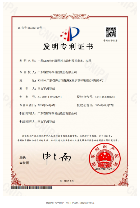 睿智憑借十余年環保粉末涂料領域的深厚積淀,針對MDF表面防護的技術瓶頸,帶領研發團隊攻堅克難,成功研發出一款MDF熱轉印粉末涂料。