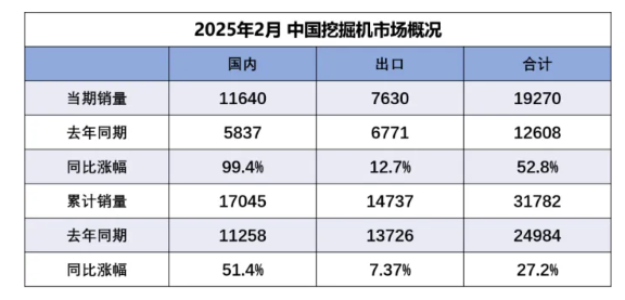 陽春三月,工程機械行業的熱度堪比歷年的“金九銀十”。2025年2月,銷售各類挖掘機19270臺,同增52.8%。其中國內銷量11640臺,同增99.4%;出口量7630臺,同增12.7%。
