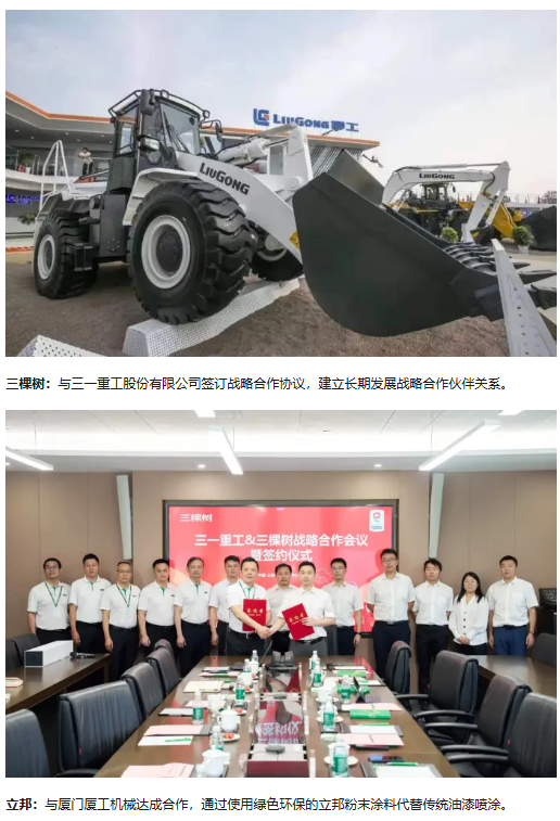 巴斯夫:為中聯重科全新涂裝的產品提供先進的涂料技術和創新型涂料解決方案;同柳工集團共同發起“紫荊花”項目,旨在優化柳工裝載機外觀質量和噴涂成本。