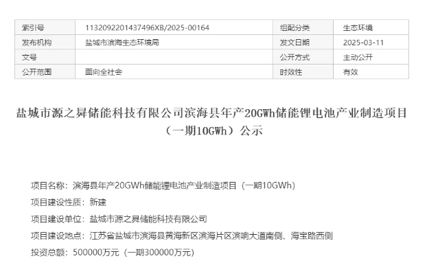近日,江蘇濱海縣人民政府發(fā)布鹽城市源之曻儲(chǔ)能科技有限公司濱海縣年產(chǎn)20GWh儲(chǔ)能鋰電池產(chǎn)業(yè)制造項(xiàng)目(一期10GWh)公示。