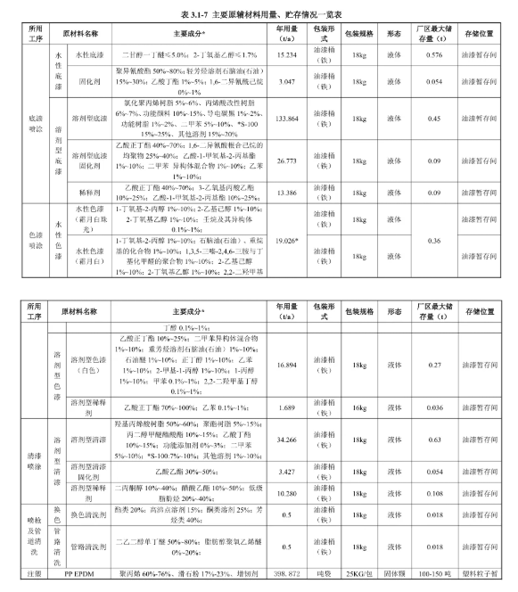 根據公示信息顯示,本項目年消涂料總量近300噸,分別為年耗水性底漆18.281噸,年消耗溶劑型底漆174.023噸,年消耗水性色漆32.412噸,年消耗溶劑型色漆18.583噸,年消耗溶劑型清漆47.973噸。
