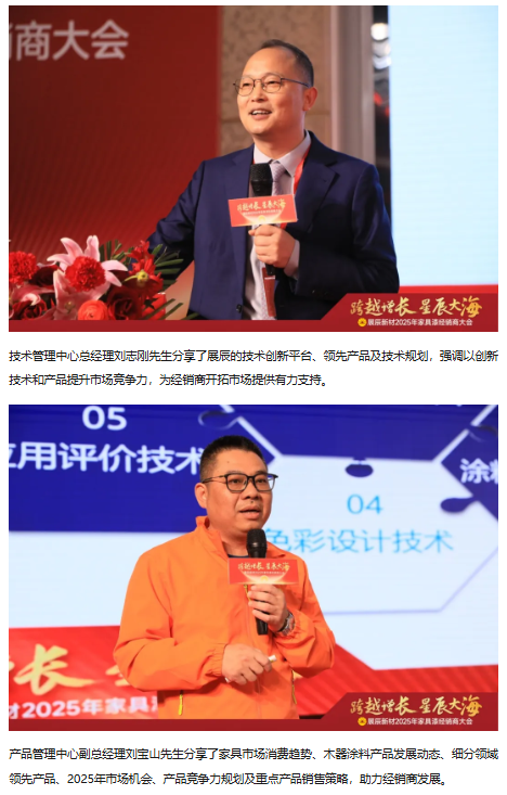 湖南省家具行業協會執行會長兼秘書長劉發剛先生,意大利博托索與弗里杰托涂料股份有限公司董事長兼CEO Mr.Alessandro Bottosso、技術總監Mr.Andrea Frighetto,廣東省涂料與油墨行業協會會長、展辰集團董事長陳冰先生,副董事長陳壽生先生,常務副總裁兼財務信息中心總經理全松林先生,輪值總裁兼華東公司總經理劉順先生,副總裁兼北方公司總經理劉華東先生,珠海工廠及海外公司總經理李旭汕先生,膠粘劑事業部總經理周言明先生,戰略投資部及國際貿易部總經理肖志軍先生,人事行政中心總經理熊焰女士,技術管理中心總經理劉志剛先生,生產供應中心總經理肖勁先生,市場營銷中心總經理楊求貴先生,產品管理中心副總經理劉寶山先生等嘉賓及領導,與經銷商代表們歡聚一堂,共同回顧2024年攜手走過的不凡征程,展望2025年的宏偉藍圖,攜手同心,全面開啟2025年的新征程。