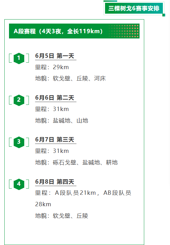 隨著集結儀式的圓滿結束,三棵樹戈6的征程正式拉開帷幕。A隊勇士們將在接下來的四天三夜里,穿越戈壁、河谷、山脈、鹽堿地,完成119公里的艱難挑戰;而AB隊勇士們則將在A隊119公里基礎上,繼續前行四天三夜,完成更為艱苦的120公里B段路線。兩支隊伍將書寫屬于三棵樹的傳奇故事,用實際行動詮釋“超越自我 永遠向上——走沒有人走過的路”的戈6主題。