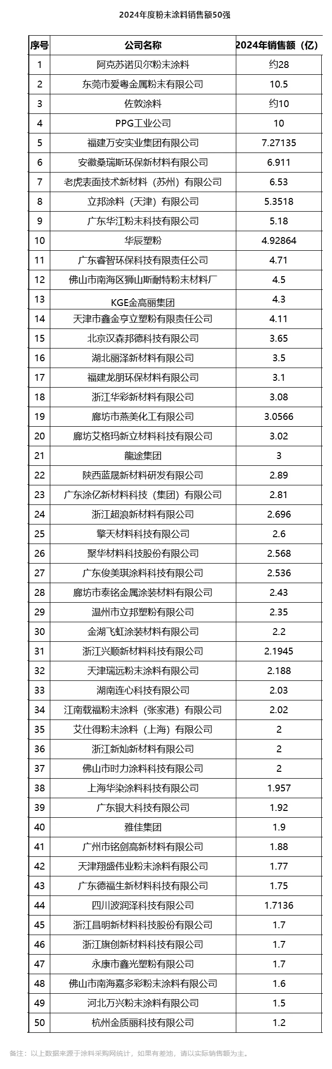 進一步聚焦國內市場,以這一規模數據為基準進行測算,2024年粉末涂料銷售額50強企業的表現堪稱驚艷。它們在市場中的份額占比高達49%,近乎占據了中國粉末涂料市場的“半壁江山”,在中國粉末涂料行業的發展進程中,猶如中流砥柱,占據著絕對領先的地位,引領著整個行業不斷向前邁進。