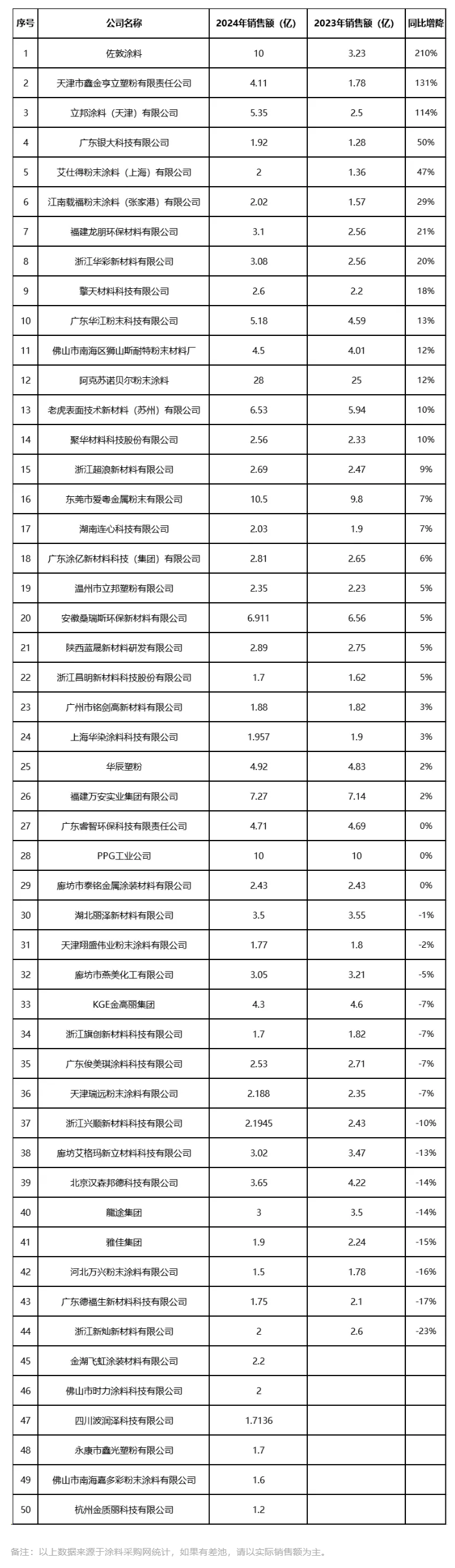 近日,涂料行業極具影響力的專業新媒體服務平臺——涂料采購網正式發布了備受矚目的“2024年粉末涂料銷售額50強榜單”。今年榜單的入圍門檻大幅提升至1.5億元,這一高標準猶如一道分水嶺,將真正具備實力的粉末涂料企業篩選出來,也側面反映出行業競爭的激烈程度。