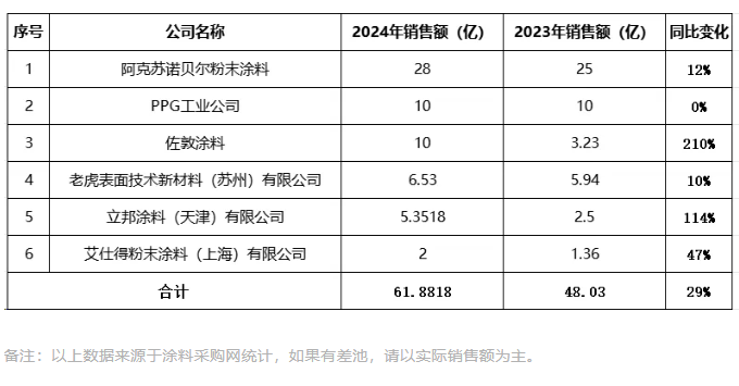 在國內環保政策持續升溫的大環境之下,粉末涂料的市場份額越來越大,給很多頭部粉末涂料企業創造了很大的發展空間。根據涂料采購網不完全統計,在2024年粉末涂料銷售額50強當中,6家外資企業的粉末涂料銷售總額為61.88億,同比增長29%;占2024年粉末涂料銷售額50強企業銷售總額的31.75%,這一比例較2023年同期增長4.85%。