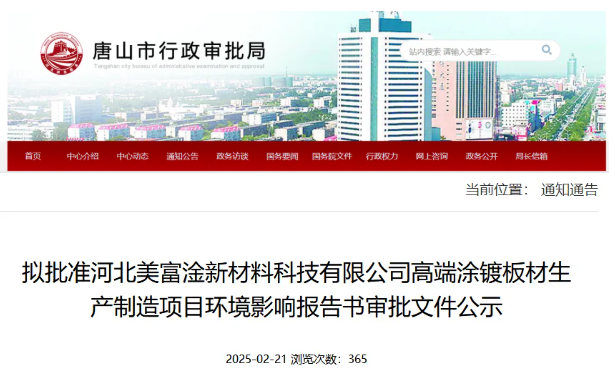 河北美富淦新材料科技有限公司擬投資34.5億元建設的高端涂鍍板材生產制造項目,已于2024年6月24日在樂亭縣行政審批局備案,備案編號為樂審批項備〔2024〕7-0048.