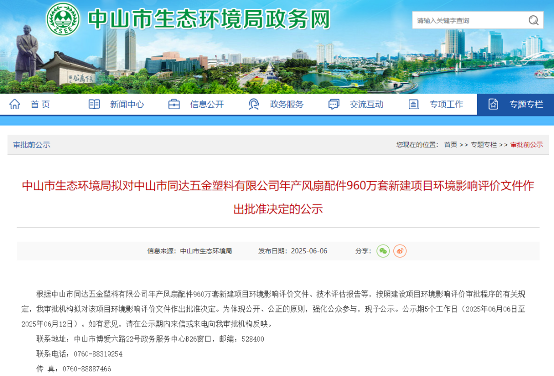 項目名稱:中山市同達五金塑料有限公司年產風扇配件960萬套新建項目