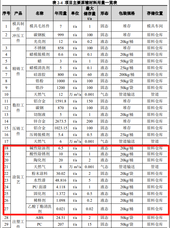 根據企業公開信息顯示,本項目年用粉末涂料30.02噸,年用水漆48.816噸,年用PU面漆4.118噸。