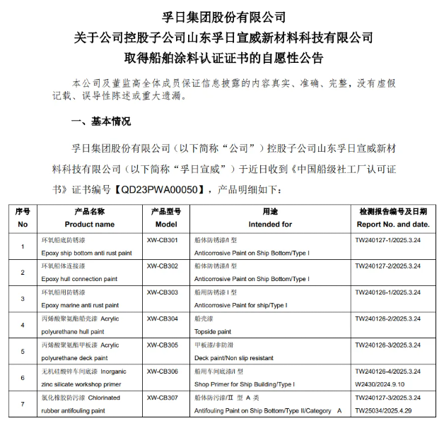 此次船舶涂料產品認證的獲得,是孚日股份在涂料業務發展道路上的重要里程碑。未來,公司將以此為契機,進一步加大在涂料研發、生產和市場推廣方面的投入,不斷提升產品競爭力。同時深耕海工、石化能源、汽車、船舶等核心領域,全力拓展業務機會,致力于成為涂層材料領域具有全球影響力和競爭力的一流企業。