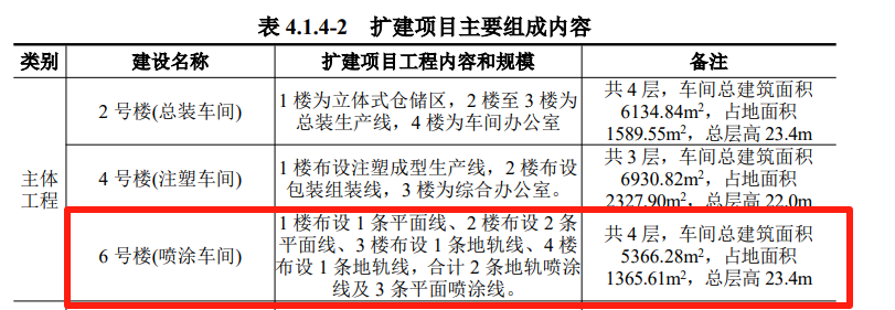 根據(jù)企業(yè)公開消息顯示,本次擴建項目新建5條噴涂線,其中包括2條地軌噴涂線以及3條平面噴涂線。噴涂車間共4層,車間總建筑面積5366.28平方米,占地面積1365.61平方米,總層高23.4米。