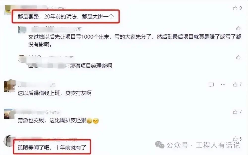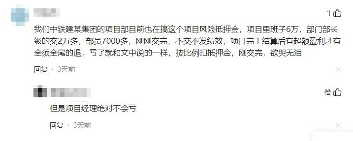 某網(wǎng)友還透露,中鐵建某集團(tuán)的項(xiàng)目部也在推行項(xiàng)目風(fēng)險(xiǎn)抵押金制度,項(xiàng)目班子需繳納6萬,部門部長級交2萬多,部員7000多,同樣存在“不交不發(fā)績效”的情況,進(jìn)一步印證了此類現(xiàn)象在行業(yè)內(nèi)的蔓延。