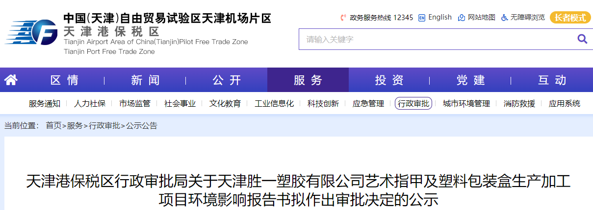 天津港保稅區行政審批局發布關于天津勝一塑膠有限公司藝術指甲及塑料包裝盒生產加工項目環境影響報告書擬作出審批決定的公示。