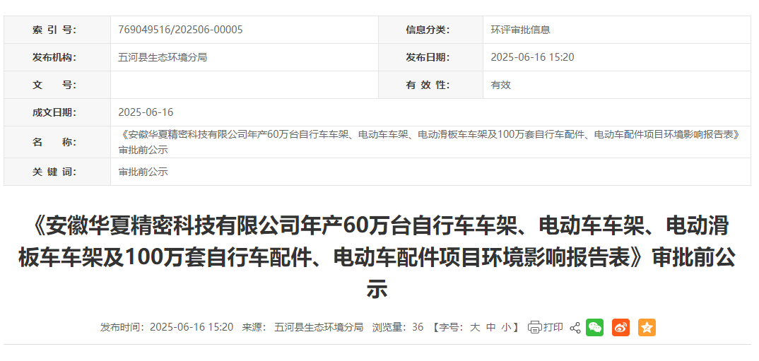 近日,五河縣生態(tài)環(huán)境分局發(fā)布《安徽華夏精密科技有限公司年產(chǎn)60萬臺自行車車架、電動(dòng)車車架、電動(dòng)滑板車車架及100萬套自行車配件、電動(dòng)車配件項(xiàng)目環(huán)境影響報(bào)告表》審批前公示。