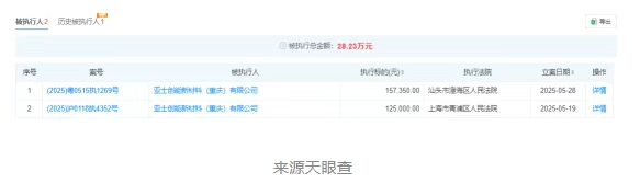 亞士創能新材料(重慶)有限公司2025年5月份以來,2次被列入被執行人名單,執行標的23.23萬元。