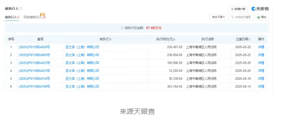 亞士漆(上海)有限公司自5月份以來,6次被列入被執行人名單,執行總標的97.88萬元。