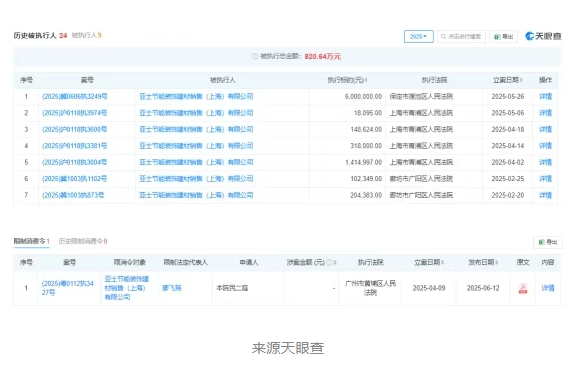亞士節能裝飾建材銷售(上海)有限公司2025年以來7次被入被執行人名單,執行總標的820.64萬元。其法定代表人廖飛瑤已被限制高消費。