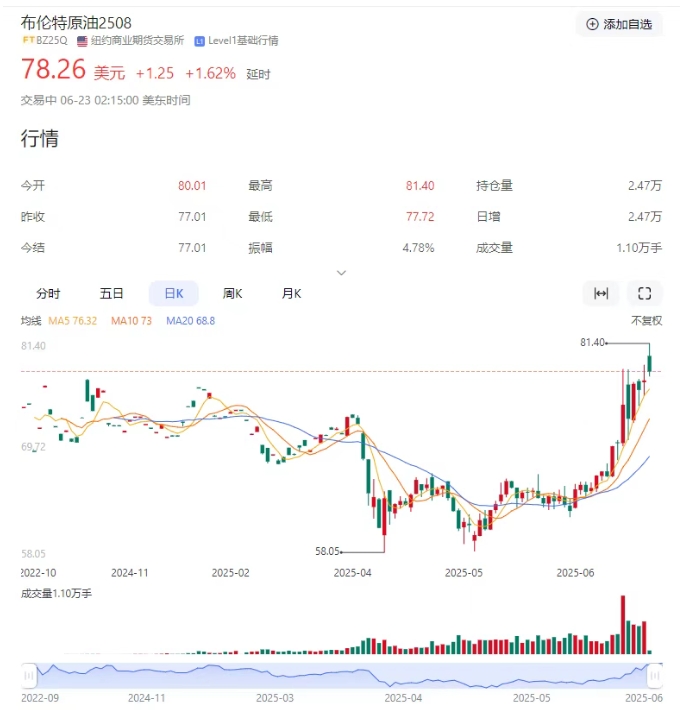 受國際形勢變化的影響,6月23日布倫特原油2508盤內是高上漲至81.4美元,自6月份以來上漲23%,再創新高。