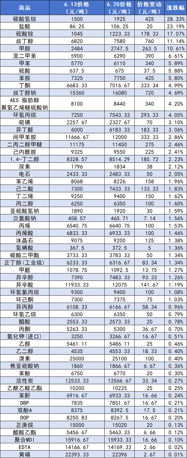 碳酸氫銨目前報價1925元/噸,較沖突發生時價格上漲425元/噸,漲幅高達28.33%;鹽酸報價106.25元/噸,上漲20元/噸,漲幅23.19%;硫酸銨報價1223.33元/噸,上漲178.33元/噸,漲幅17.07%。此外,叔丁醇、甲醇、混二甲苯、甲苯、硫酸、苯胺、丁酮、叔丁醇鈉、AES脂肪醇聚氧乙烯醚硫酸鈉、環氧丙烷等化工產品價格均有不同程度上漲,漲幅從4.05%到11.14%不等。