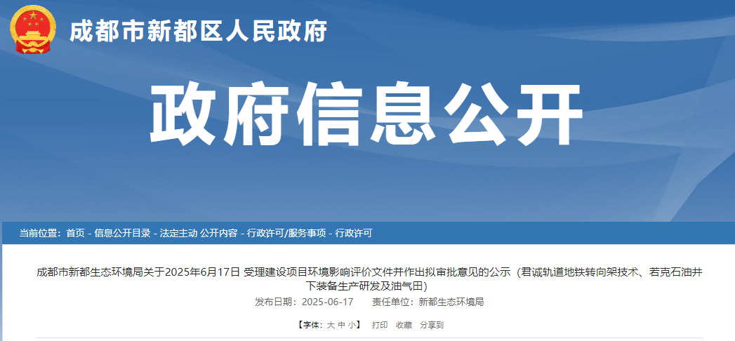 近日,成都市新都區(qū)人民政府發(fā)布關(guān)于2025年6月17日受理建設(shè)項(xiàng)目環(huán)境影響評價(jià)文件并作出擬審批意見的公示(君誠軌道地鐵轉(zhuǎn)向架技術(shù)、若克石油井下裝備生產(chǎn)研發(fā)及油氣田)。