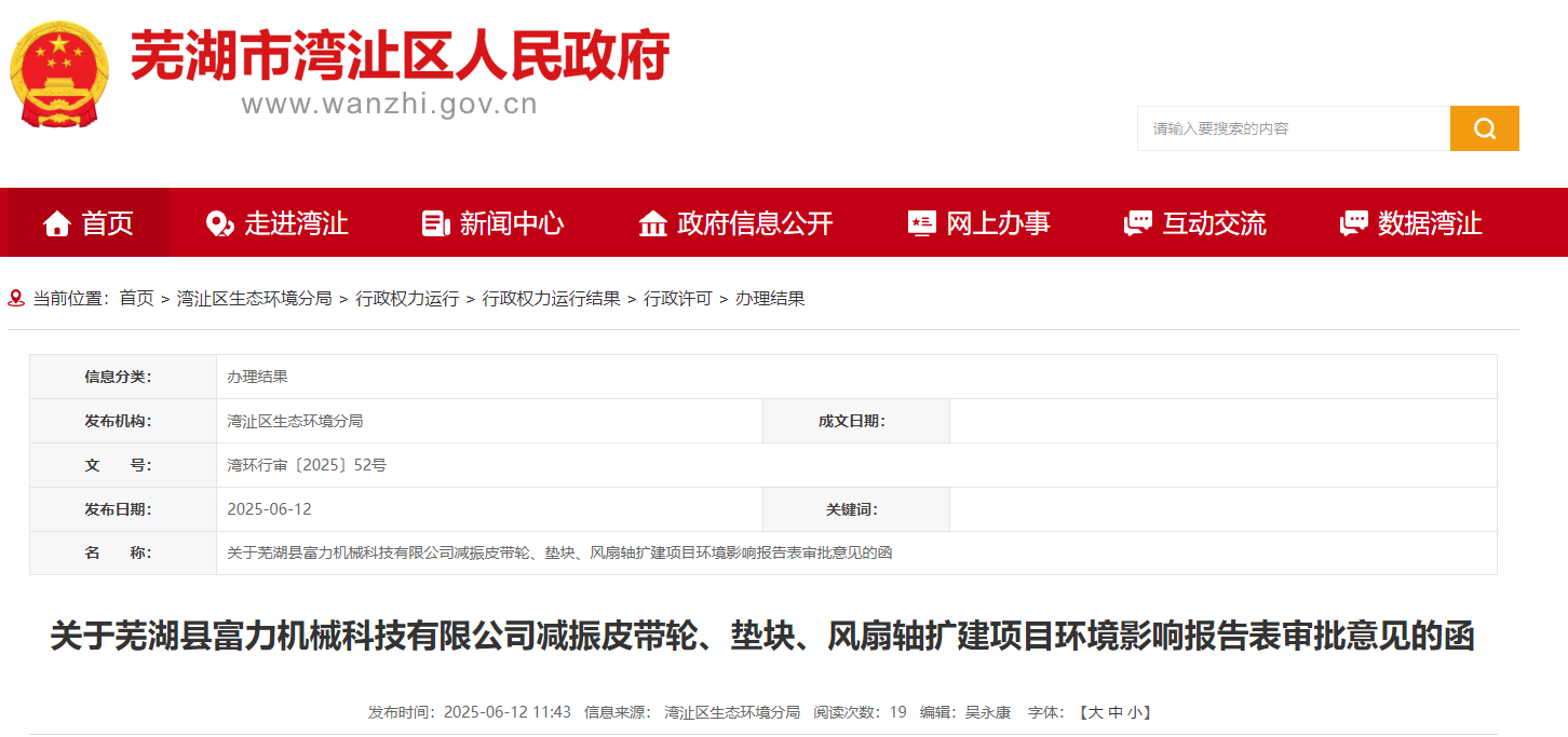 你公司報送的《蕪湖縣富力機械科技有限公司減振皮帶輪、墊塊、風扇軸擴建項目環境影響報告表》(以下簡稱報告表)收悉。根據《蕪湖市生態環境局關于印發<蕪湖市建設項目環境影響評價文件分級審批管理暫行辦法>的通知》文件規定,我局決定受理該項目環評文件,按要求對《報告表》進行審查,并在灣沚區政府信息公開網進行受理與批前公示,期間未收到任何異議。現根據《中華人民共和國環境影響評價法》及有關法律法規規定,批復如下: