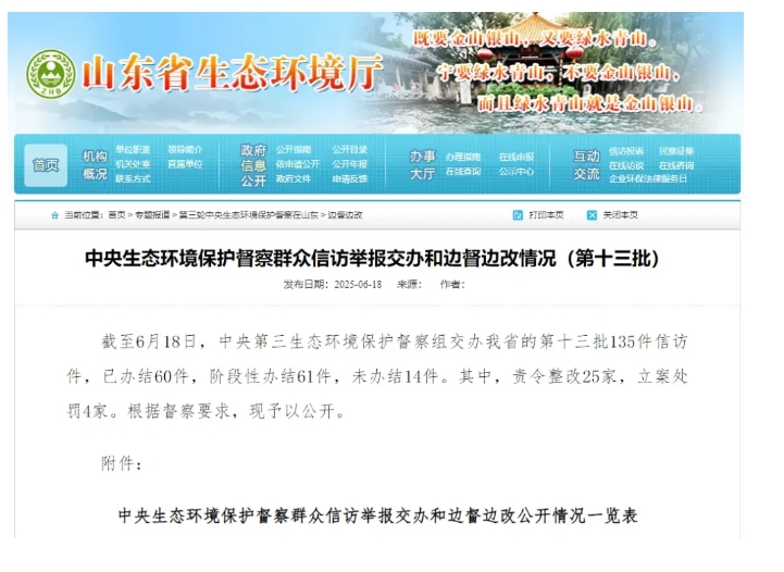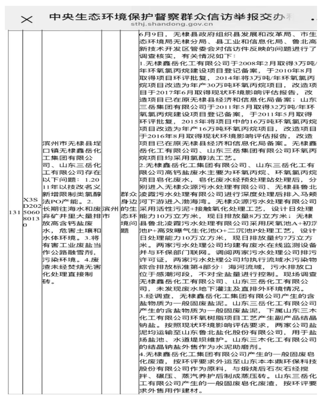 2025年5月27日,中央第三生態環境保護督察組進駐山東后,接到群眾舉報無棣鑫岳、山東三岳兩家公司存在借改造之名違規新建限制類氯醇法工藝的環氧丙烷、環氧氯丙烷產能,長期違規排放高含鈣鹽廢水、將有害工業廢鹽當作公路融雪劑和廢渣未經焚燒無害化處理直接制磚等違規情況。對于群眾舉報情況,山東省生態環境廳在6月18日第十三批“中央生態環境保護督察群眾信訪舉報交辦和邊督邊改公開情況一覽表”中予以通告并回復。