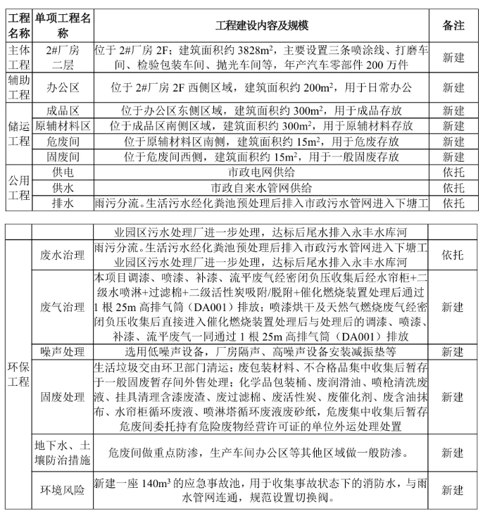 建設(shè)規(guī)模:項(xiàng)目位于安徽省合肥市長豐縣下塘鎮(zhèn)浦東路南側(cè),租賃合肥裕和數(shù)控 設(shè)備制造有限公司2#廠房二層進(jìn)行生產(chǎn),建筑面積約3828m2.購置預(yù)熱爐、手動(dòng)除 塵柜、九軸往復(fù)機(jī)等生產(chǎn)設(shè)備建設(shè)三條噴涂線及相關(guān)配套生產(chǎn)設(shè)備,項(xiàng)目建成后可形 成年產(chǎn)汽車零部件200萬件的生產(chǎn)能力