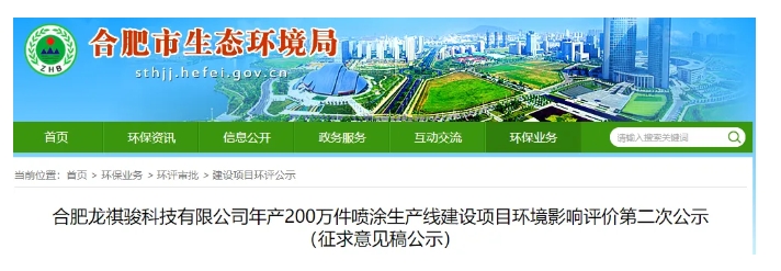近日,合肥市生態(tài)環(huán)境局發(fā)布合肥龍祺駿科技有限公司年產(chǎn)200萬件噴涂生產(chǎn)線建設(shè)項(xiàng)目環(huán)境影響評(píng)價(jià)第二次公示(征求意見稿公示)。