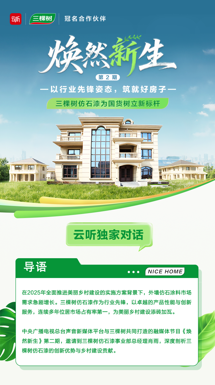6月26日,中央廣播電視總臺聲音新媒體平臺云聽與三棵樹共同打造的融媒體節目《煥然新生》第二期上線。本期節目聚焦三棵樹仿石漆,了解三棵樹仿石漆作為行業先鋒,憑借卓越的產品性能和創新服務,連續多年位居市場占有率第一。 讓我們一起走進云聽《煥然新生》第二期,揭曉三棵樹仿石漆如何憑自身優勢,為建筑外墻美學添磚加瓦!
