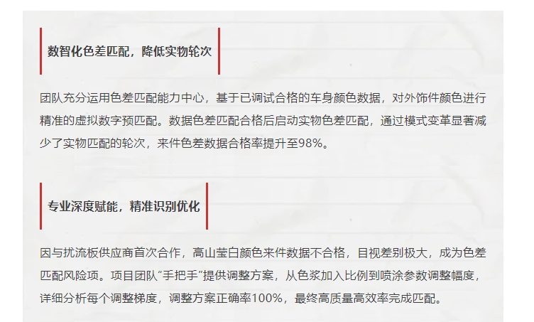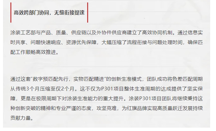 在紅旗品牌加速發展的關鍵時期,P301項目作為首個生準周期壓縮至10個月以內的標桿性短周期項目,對各個環節提出了極致效率要求。作為涂裝生準階段的核心環節,色差匹配工作面臨前所未有的周期挑戰。P301項目團隊打破常規,創新采取數智化色差匹配、專業深度賦能、高效跨部門協同三大核心舉措,向傳統周期3個月發起挑戰。 (來源:一汽工程人涂裝工藝部)