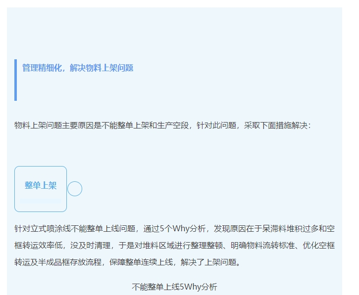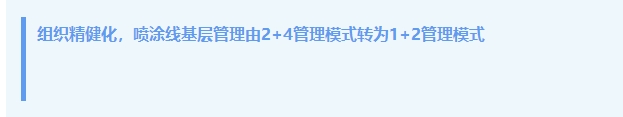 三精管理中提出“企業(yè)也要剪枝”,河南公司根據(jù)車間工序?qū)嶋H需求,整合所有噴涂線的上架、下架職能,分別設(shè)專職班長(zhǎng)管理,上下架形成監(jiān)督;同時(shí)將原分屬兩個(gè)生產(chǎn)車間的噴涂線跟班主任崗位,由一人統(tǒng)管;此舉縮短管理鏈、統(tǒng)一作業(yè)標(biāo)準(zhǔn)、形成監(jiān)督機(jī)制,改革后基層管理人員精簡(jiǎn)50%,生產(chǎn)效率與產(chǎn)量雙提升。