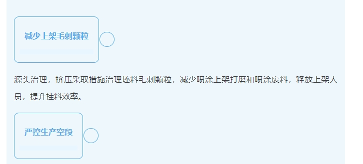 加強(qiáng)排產(chǎn)訂單管理,相同顏色固定生產(chǎn)線;試噴樣板和實(shí)際生產(chǎn)在相同生產(chǎn)線,從而減少噴涂色差,減少返噴。根據(jù)不同客戶需求調(diào)整噴涂工藝,并形成工藝標(biāo)準(zhǔn)固化,穩(wěn)定產(chǎn)品質(zhì)量。