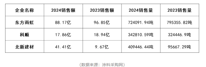 數據顯示,東方雨虹2024年銷售額88.17億,同比下降8.96%;銷售量72.41萬噸,同比下降8.96%。科順股份2024年表現:銷售額17.86億,下降5.7%;銷售量34.28萬噸,增長5.67%,銷量增但營收降,反映價格競爭加劇。由于2024年北新建材防水業務并表嘉寶莉,銷售額和銷售量同比大幅增長,但這一增長主要來自并購而非內生增長,因此不具備行業可比性。
