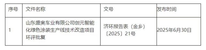 濟(jì)寧市生態(tài)環(huán)境局金鄉(xiāng)縣分局發(fā)布關(guān)于作出山東盛奧車(chē)業(yè)有限公司創(chuàng)元智能化綠色涂裝生產(chǎn)線(xiàn)技術(shù)改造項(xiàng)目批復(fù)的公告。