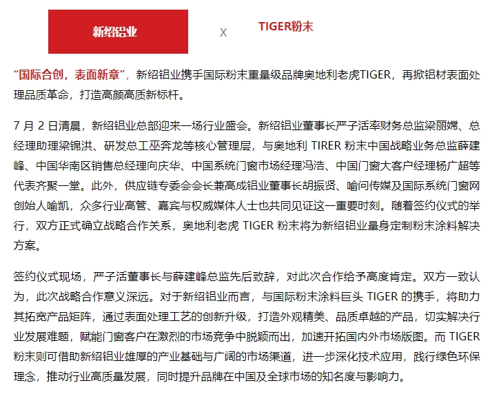 值得關注的是,借助老虎粉末的國際品牌影響力,新紹的產品在開拓海外市場時更具競爭力。作為門窗產業鏈上游的核心鋁材企業,新紹與國際化粉末涂料技術引領者 TIGER 的戰略合作,不僅為雙方發展注入新動能,更為整個門窗產業鏈的優化升級提供強大助力。